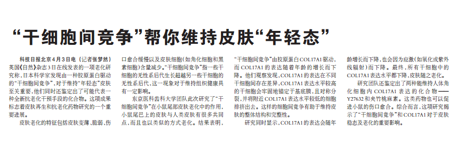 科技日?qǐng)?bào)北京4月3日電(記者張夢(mèng)然)英國(guó)《自然》雜志3日在線發(fā)表的一項(xiàng)老化研究稱,日本科學(xué)家發(fā)現(xiàn)由一種膠原蛋白驅(qū)動(dòng)的“干細(xì)胞…