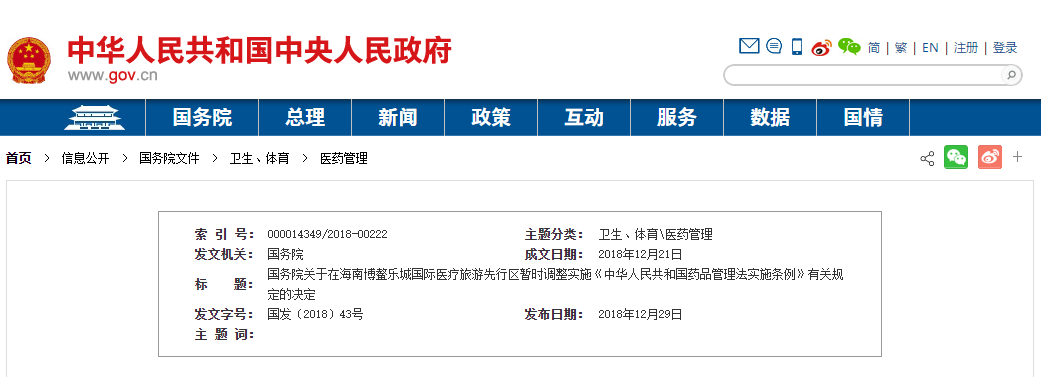 2019-01-21 查看更多近日,國(guó)務(wù)院發(fā)布《關(guān)于在海南博鰲樂(lè)城國(guó)際醫(yī)療旅游先行區(qū)暫時(shí)調(diào)整實(shí)施<中華人民共和國(guó)藥品管理法實(shí)施條例>有關(guān)規(guī)定的決定》。國(guó)務(wù)院決定,在海南博鰲樂(lè)城國(guó)際醫(yī)療旅游先行區(qū)暫時(shí)調(diào)整實(shí)施《中華人民共和國(guó)藥品管理法實(shí)施條例》第三十六條的規(guī)定,對(duì)先行…