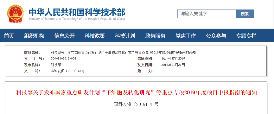2019-01-30 查看更多2019年1月21日,我國(guó)科技部官網(wǎng)正式發(fā)布了“干細(xì)胞及轉(zhuǎn)化研究”重點(diǎn)專(zhuān)項(xiàng)2019年度項(xiàng)目申報(bào)指南,指南中明確:在之前已支持98個(gè)項(xiàng)目的基礎(chǔ)上,2019年國(guó)家再撥款4億元,支持12個(gè)干細(xì)胞研究方向。其中干細(xì)胞資源庫(kù)、干細(xì)胞治療性腺衰老也寫(xiě)入申報(bào)指南。指南中明確…